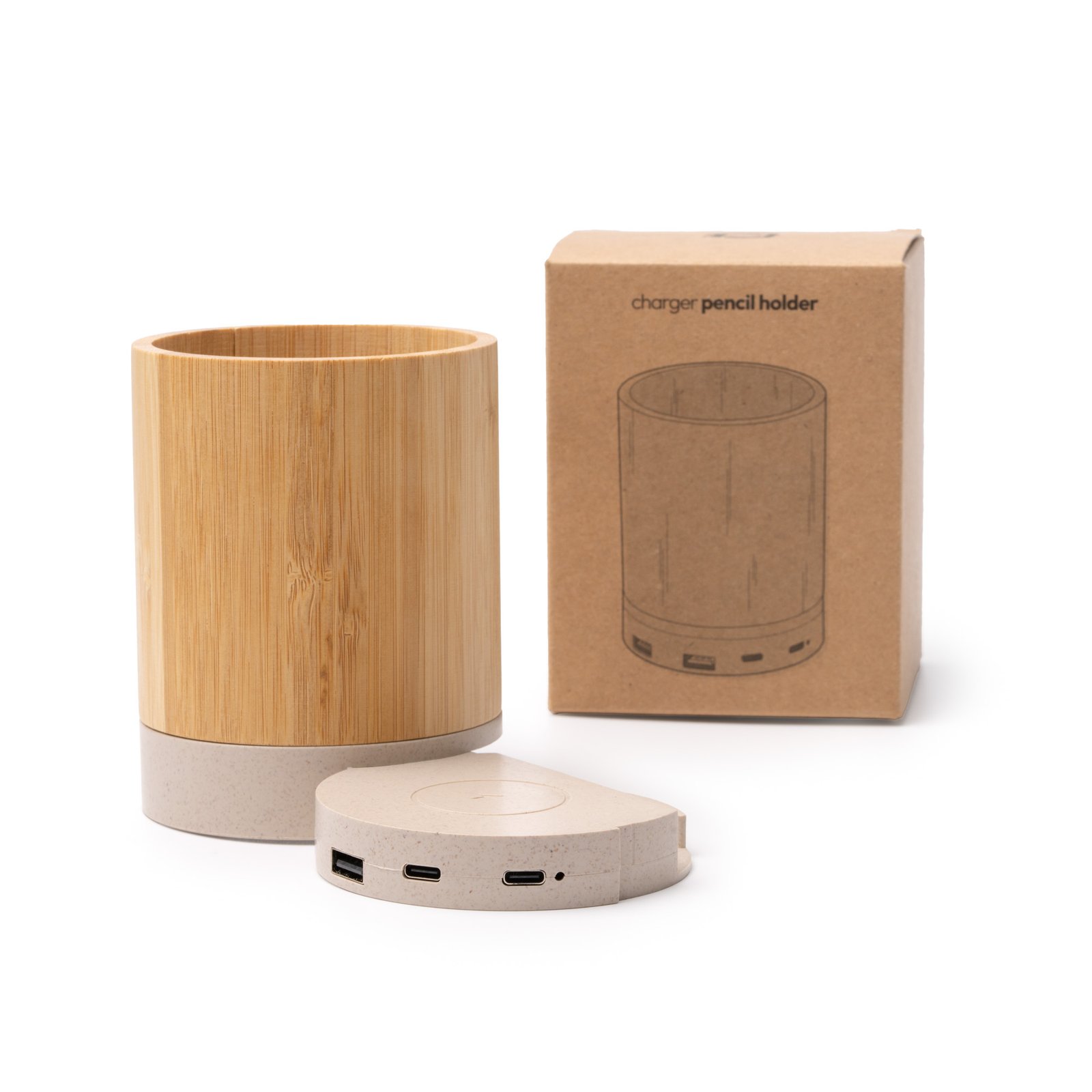 Lapicero multifunción con cuerpo elaborado en bambú y base con función de cargador inalámbrico realizado en fibra de trigo. La base de carga es extraíble del lapicero mediante un punto de anclaje deslizándola lateralmente. Potencia de cargador inalámbrico de 15W. Incluye soporte para Smartphone en la base de carga e indicador luminoso de confirmación de carga. Incluye dos puertos de salida USB y dos puertos Tipo C de entrada y salida. Compatible con dispositivos móviles provistos de tecnología de este tipo de carga.