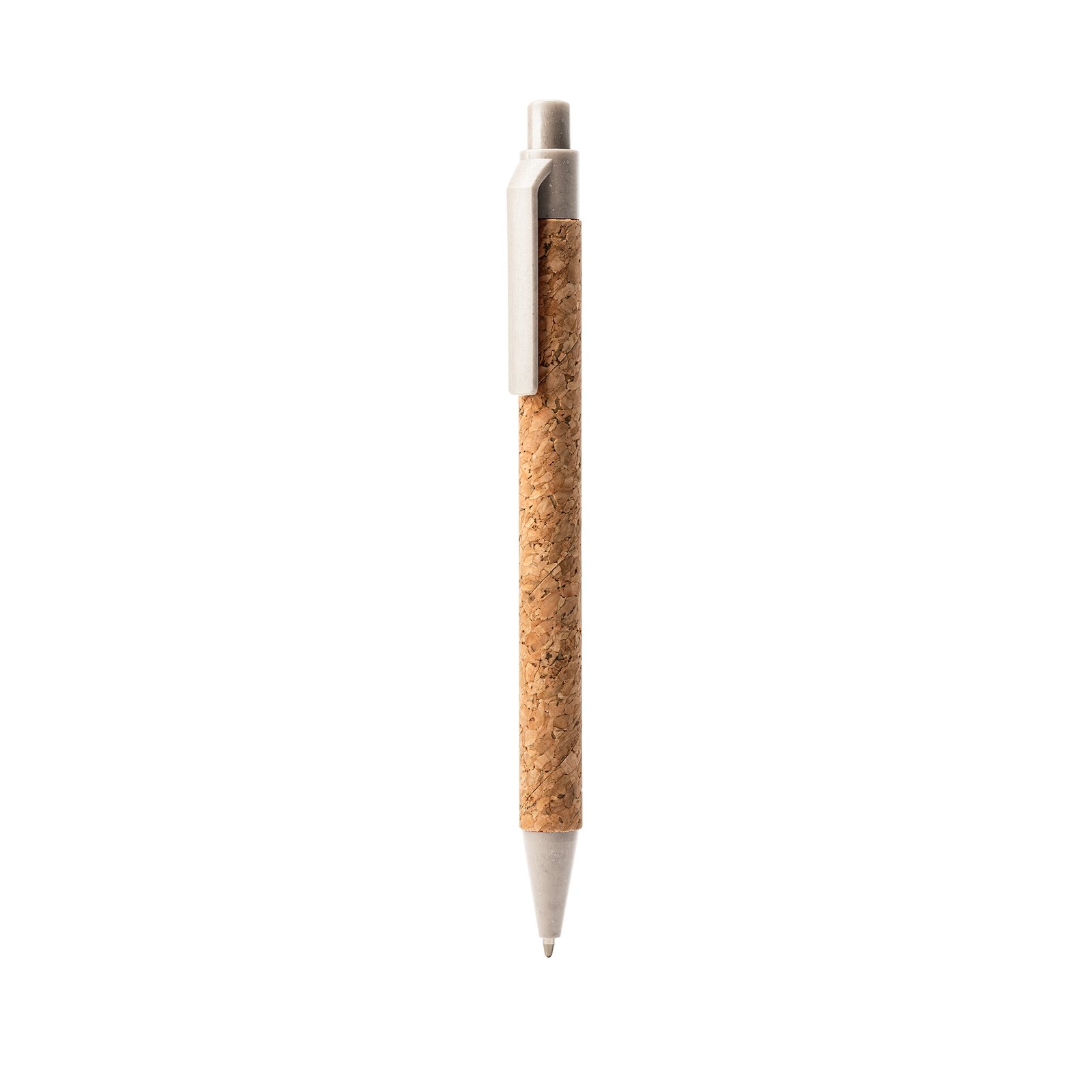 Bolígrafo línea nature con cuerpo de corcho. Punta, pulsador y clip en fibra de trigo. Tinta azul.