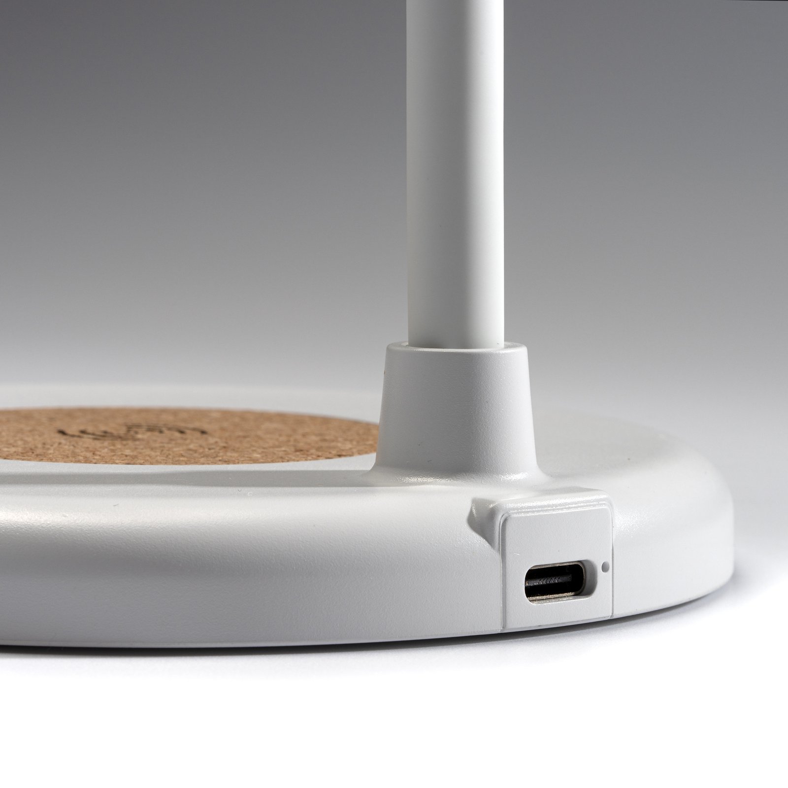 Lámpara elaborada en ABS y corcho. Luz led con tres tipo de iluminación con ajuste de intensidad mediante botón multifunción integrado en la base. Incluye altavoz inalámbrico de 3W de potencia para reproducción de audio mediante conexión Bluetooth. Con indicador luminoso de conexión. Con base de carga inalámbrica con potencia de 10W para recarga de dispositivos provistos de esta tecnología.