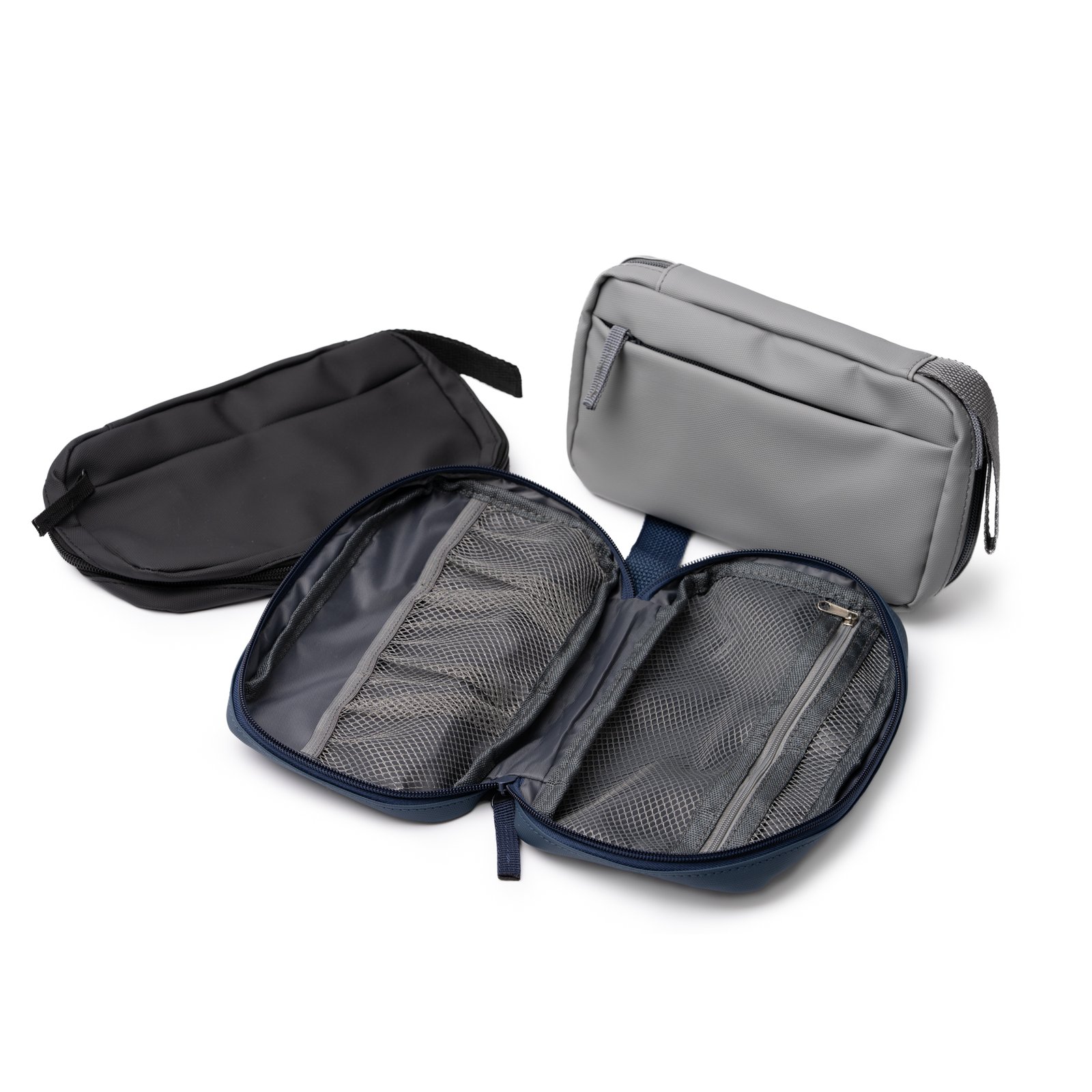 Estuche organizador elaborado en PU Leather, con apertura completa con cremallera. Cuenta con dos compartimentos interiores de malla: uno con cierre de cremallera y otro subdividido en bolsillos más pequeños. Incluye un bolsillo frontal con cierre de cremallera. Los tiradores de las cremalleras y la cinta de transporte están realizados a a color a conjunto del cuerpo.