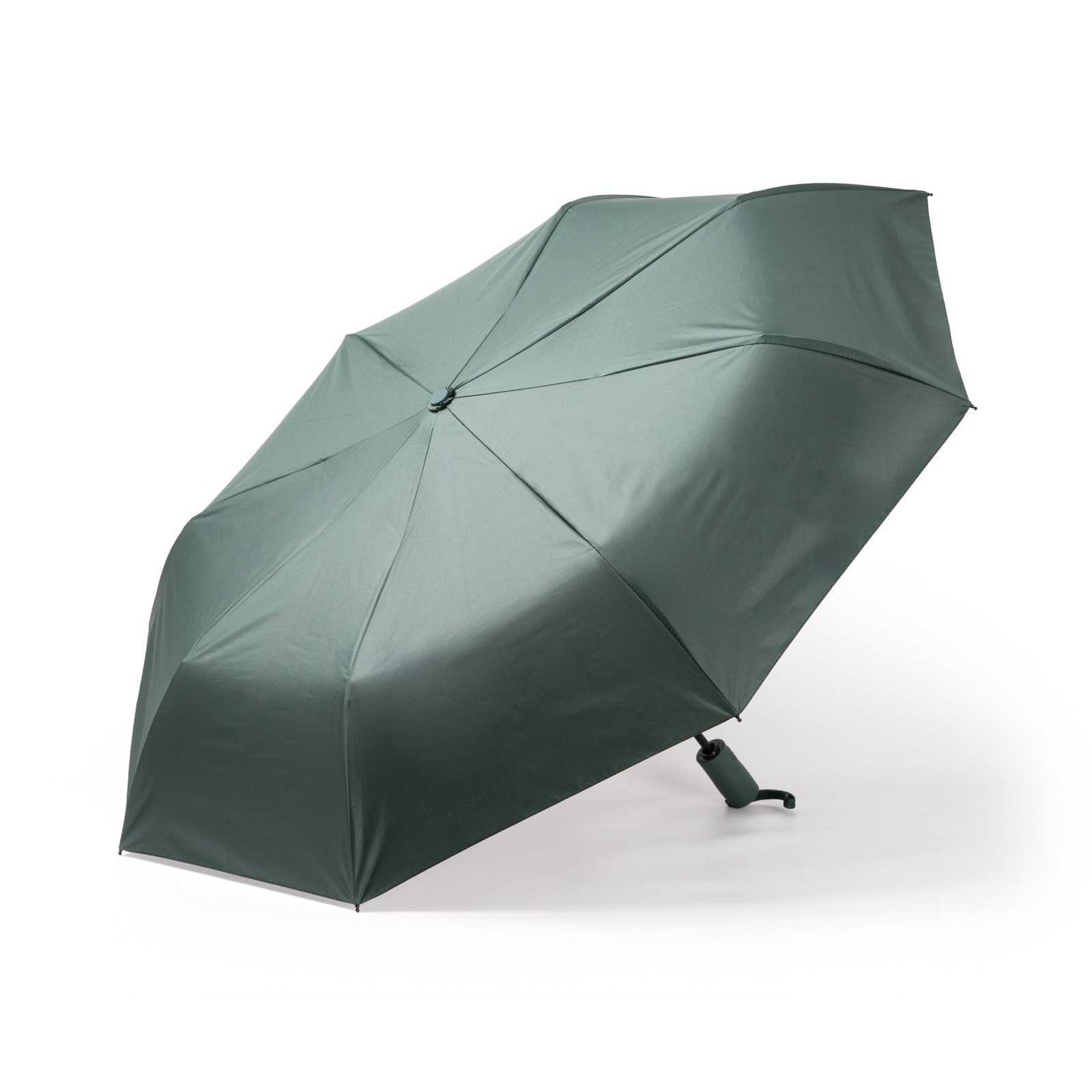 Paraguas plegable realizado en RPET y tejido pongee 190T con protección ultravioleta UV SPF50. Apertura y cierre automático, con varillas de fibra de vidrio con sistema antiventisca. Todo esto lo convierte en una opción completa y práctica, su sistema antiventisca lo hace más resistente y además te protege de los rayos ultravioleta. Cuenta con cierre de velcro. Incluye funda a juego.