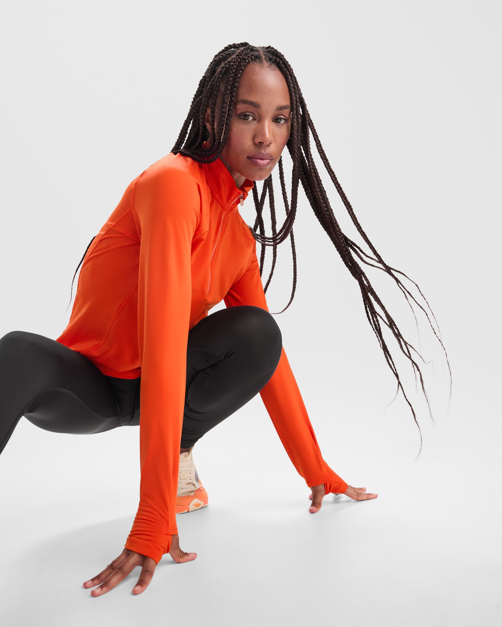 Sudadera técnica perchada manga ranglán entallada y media cremallera invertida con detalle reflectante. Cubrecosturas en cuello interno. Puños con ojal para pulgar. Detalles reflectantes en la espalda. Faldón trasero. Certificado GRS.