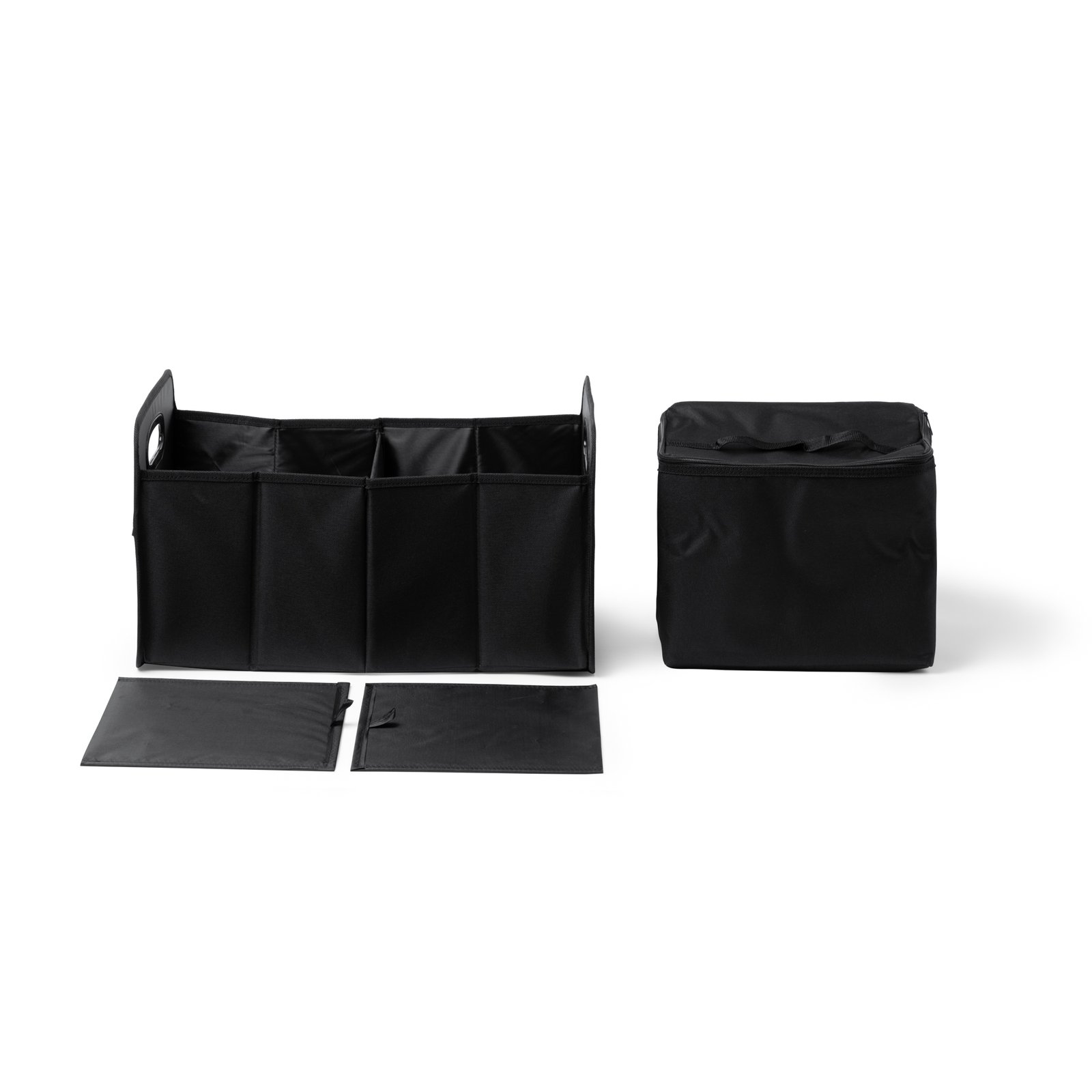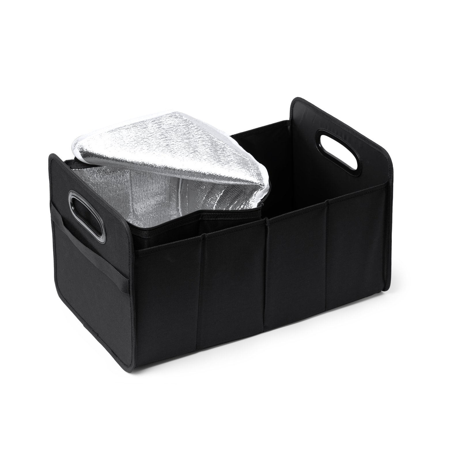 Organizador de maletero plegable con asas reforzadas. Realizado en poliéster 600D. 2 compartimentos principales y bolsillo exterior. Incluye nevera extraíble de 12L con interior isotérmico.