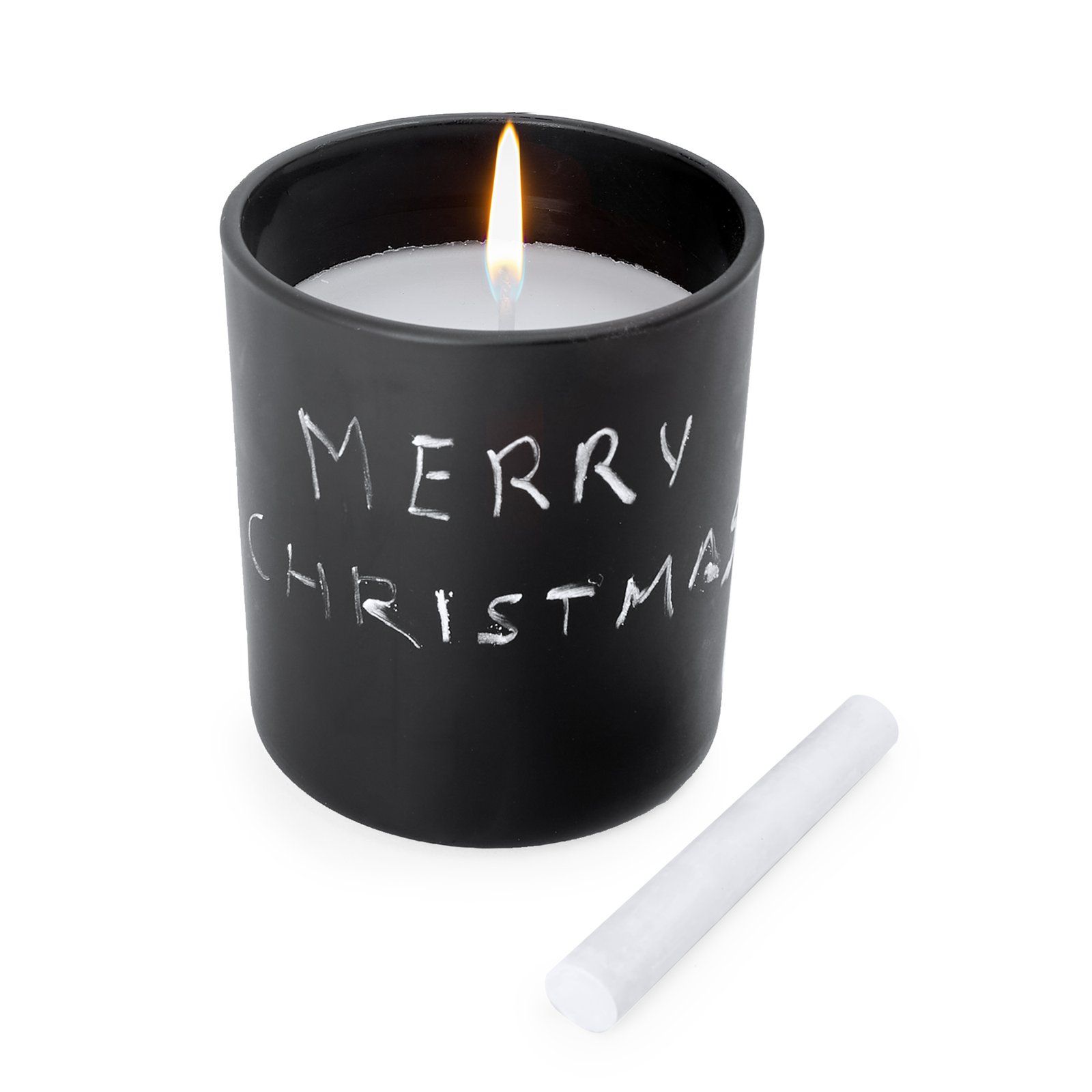 Vela aromática con olor a vainilla en recipiente cerámico negro redondo. Incluye una tiza para escribir sobre el recipiente. Vela y mecha blancas. Fragancia de vainilla.