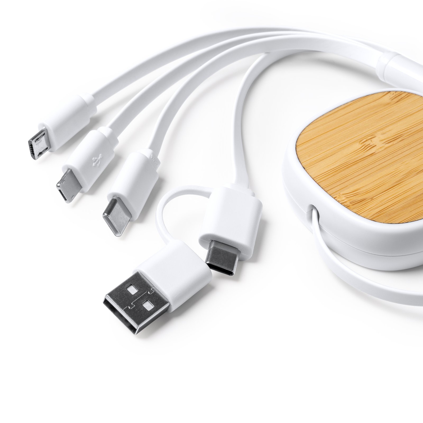 Cable cargador extensible 5 en 1, con cuerpo elaborado en ABS reciclado y bambú. Con hasta 96 cm de longitud en extensión. Con conexión de entrada USB y Tipo C y conexiones de salida Lightning, Micro USB, y Tipo C.
