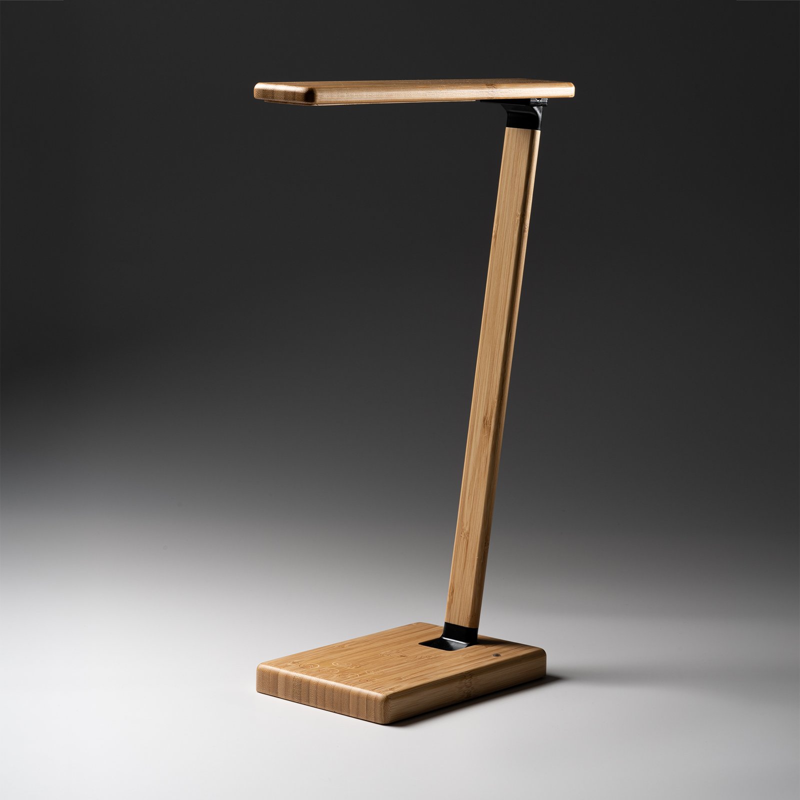 Lámpara plegable con cuerpo elaborado en bambú. Cuenta con superficie de carga inalámbrica en su base, con una potencia de 10W. Con ajuste de intensidad de iluminación mediante botones integrados en la base y temporizador de luz de 1 y 2 horas. Es plegable en ambos ángulos (base y superficie de lámpara). El cargador inalámbrico es compatible con dispositivos provistos de tecnología de carga de este tipo. Con puerto USB de salida para recarga de dispositivos y cable de conexión a corriente Tipo C incluido.