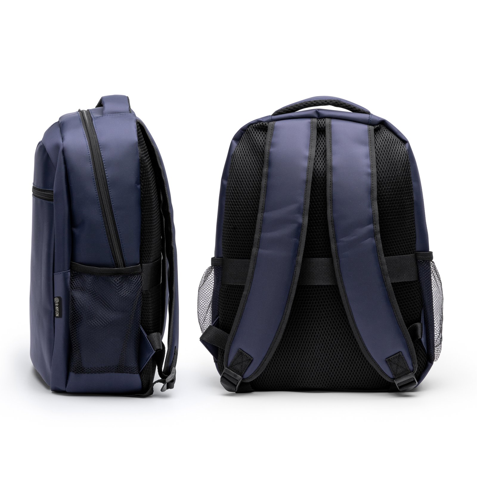 Mochila ejecutiva realizada en nylon reciclado. Gran compartimento prinicpal y bolsillo acolchado para portátil 15″. Bolsillo exterior y 2 bolsillos laterales. Asas y espalda acolchadas. Cinta para trolley.