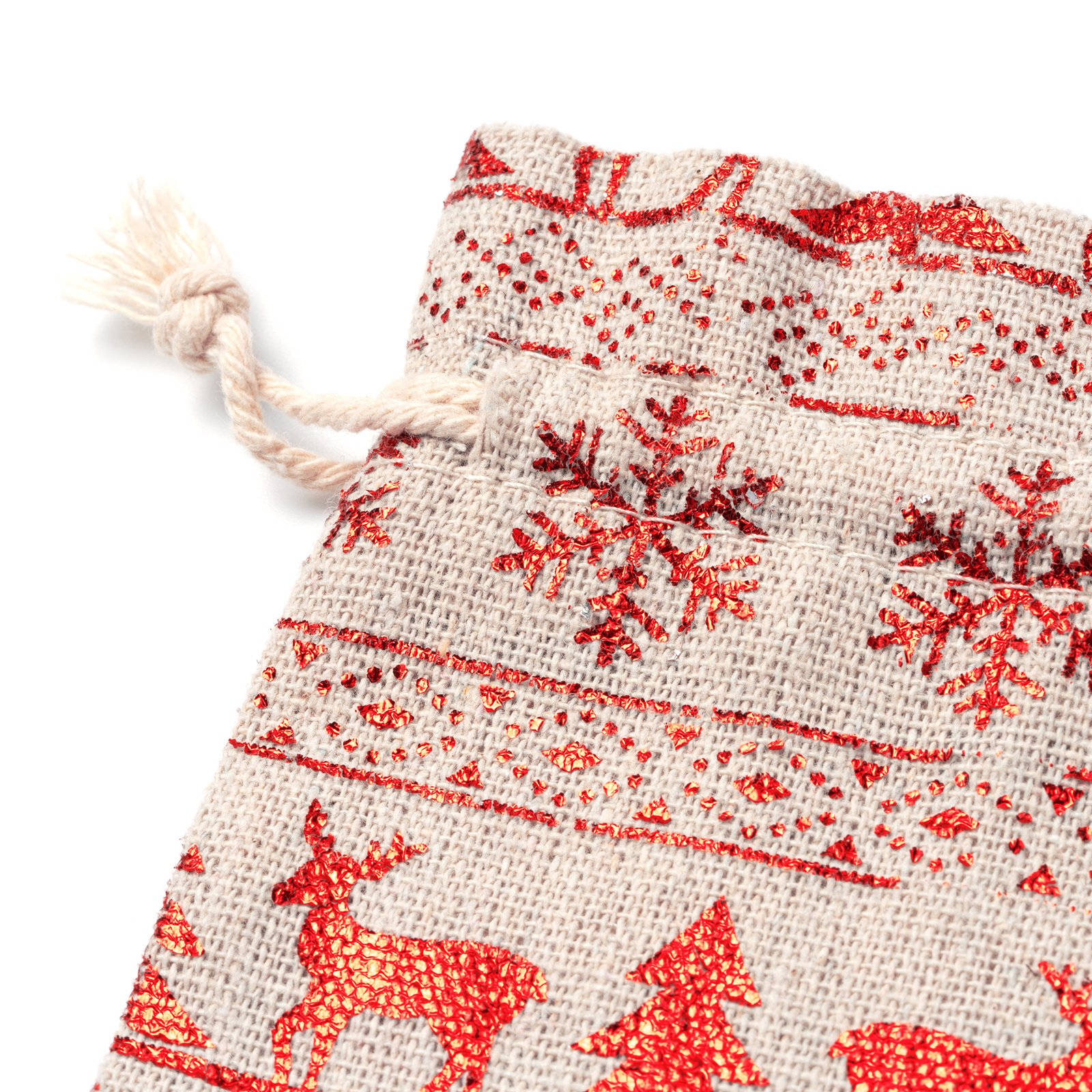 Bolsa para regalo de Navidad estampada con motivos característicos de la temporada, como árboles de Navidad, renos y copos de nieve. La otra cara de la bolsa es lisa especial para impresión. Una alternativa sostenible a los envoltorios de papel desechables, ya que se pueden reutilizar.