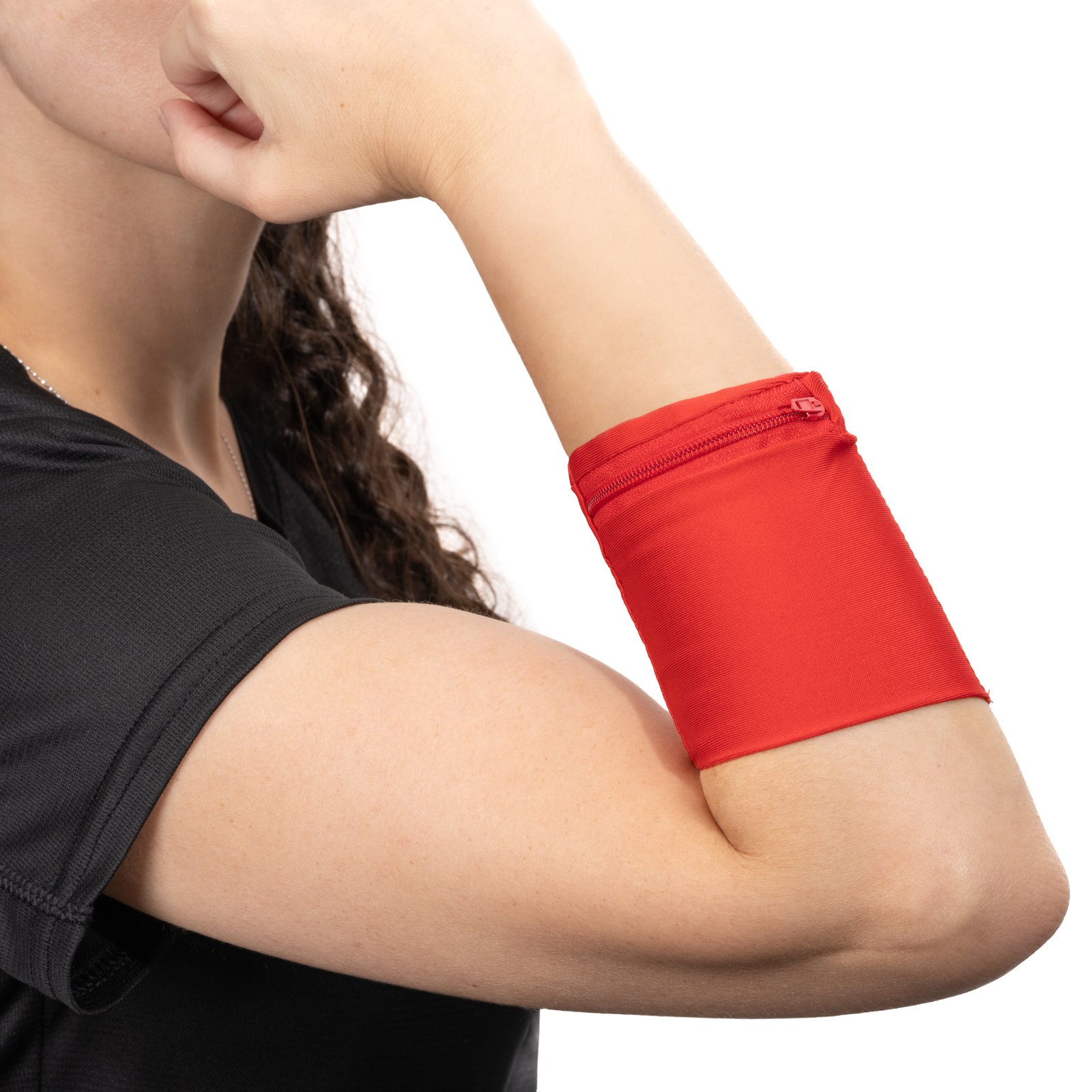Muñequera elástica con bolsillo con cierre de cremallera a juego. Una opción cómoda y versátil para almacenar tus pequeños enseres mientras haces deporte.