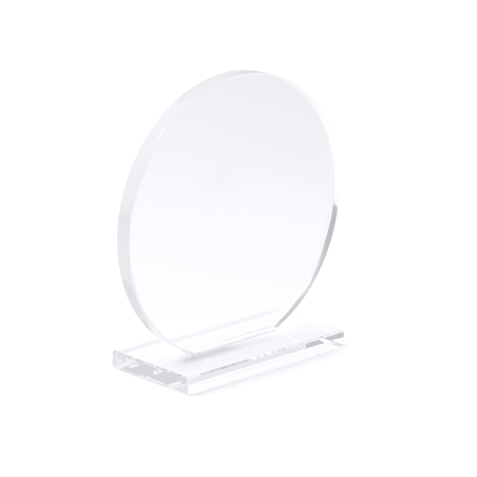 Trofeo de cristal de diseño circular con base rectangular. Incluye estuche de presentación con base acolchada en color negro.