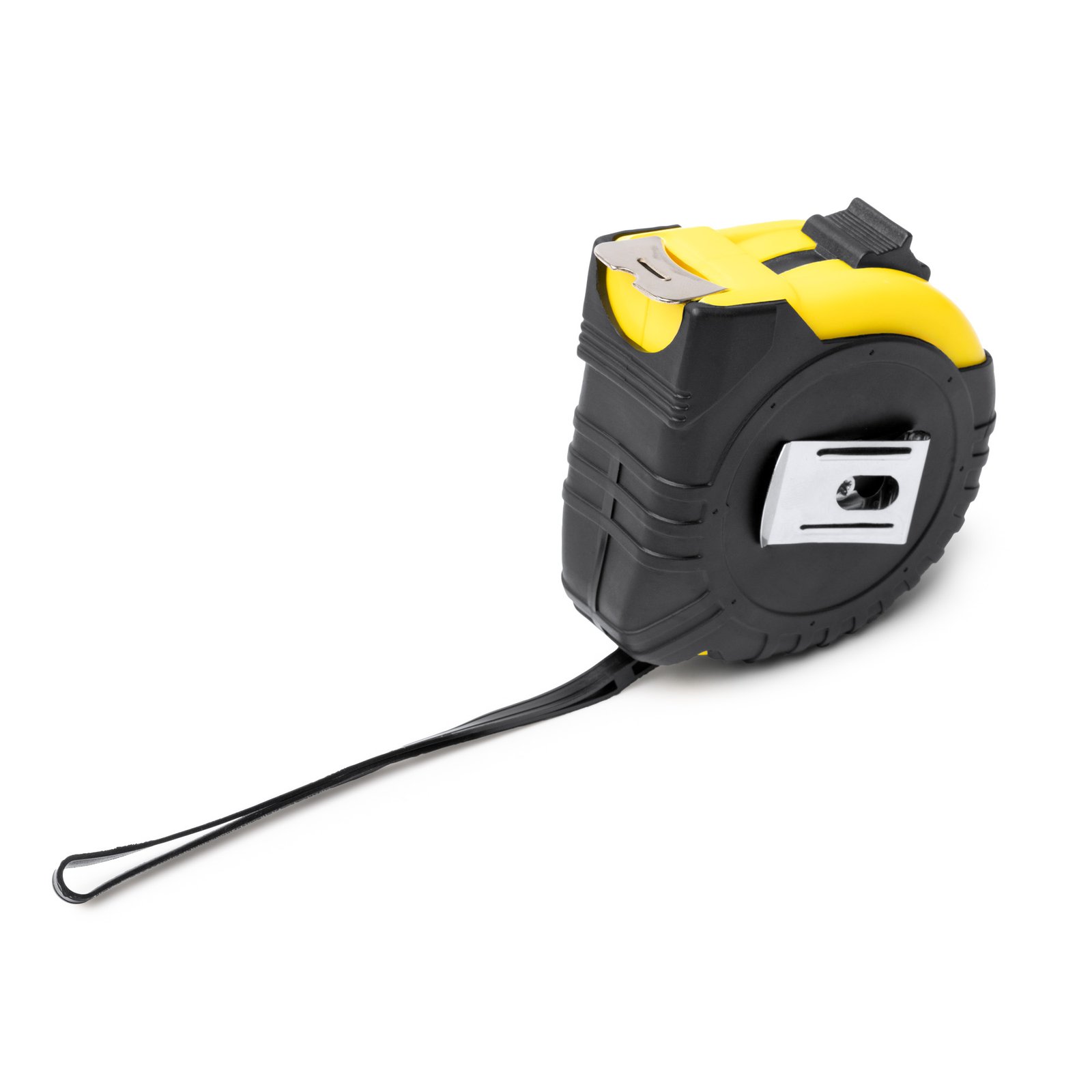 Flexómetro de 7,5 metros homologado. Con mecanismo de bloqueo y cuchilla metálica. Con funda de goma en color, clip metálico y cinta de transporte.